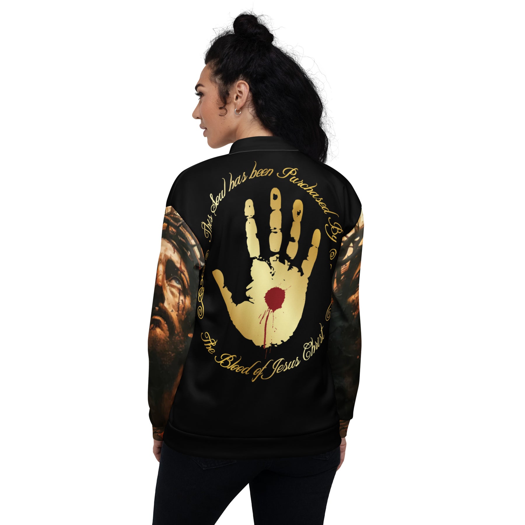 Soul Purchased Unisex Bomber Jacket Sturdy neck tape Soul Purchased Unisex Bomber Jacket Sturdy neck tape Step out clothed in truth with the Soul Purchased Bomber Jacket. Its message is rooted in Isaiah 43:1—“Fear not, for I have redeemed you; I have called you by name, you are Mine.”